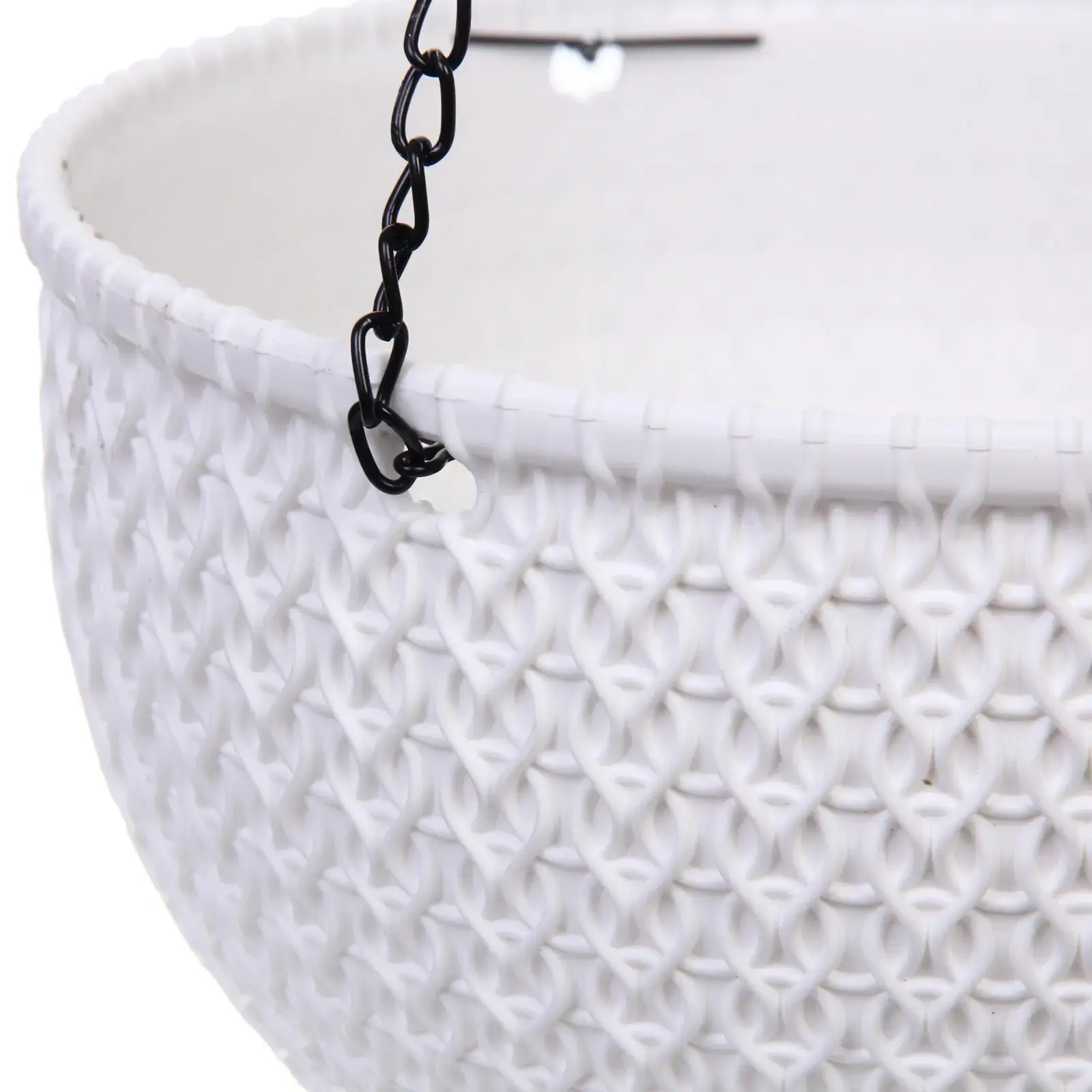 Размеры кашпо составляют 21х13 см, что делает его компактным и удобным для размещения в различных уголках вашего дома. Белый цвет и текстурированная поверхность добавляют элегантности и стиля, а черная металлическая цепочка обеспечивает надежное подвешивание. Это кашпо идеально подходит для создания вертикальных садов и уникальных композиций, которые станут ярким акцентом в вашем интерьере.