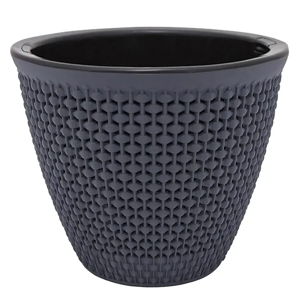 Кашпо выполнено из прочного пластика, что обеспечивает его долговечность и устойчивость к различным погодным условиям. Темно-серый цвет антрацит придаёт ему современный вид, а плетёный узор добавляет изысканности. Это кашпо станет отличным выбором как для домашнего использования, так и для оформления дачи или сада.