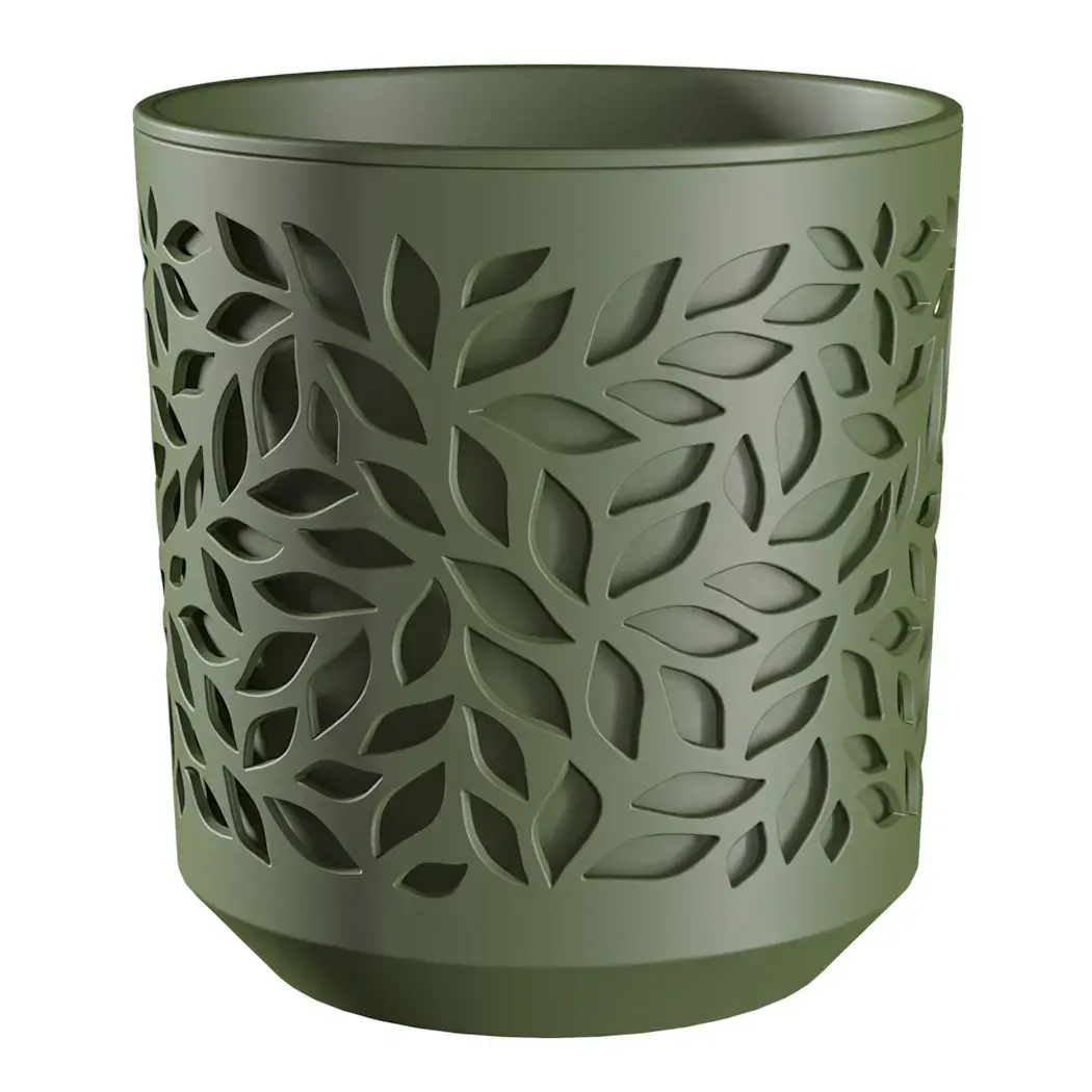 Кашпо имеет гладкую текстуру и аккуратный круглый верх, а узор в виде листьев добавляет декоративный акцент. Оно легко очищается и не требует особого ухода. Размеры кашпо позволяют использовать его как в помещении, так и на улице, что делает его универсальным решением для озеленения.