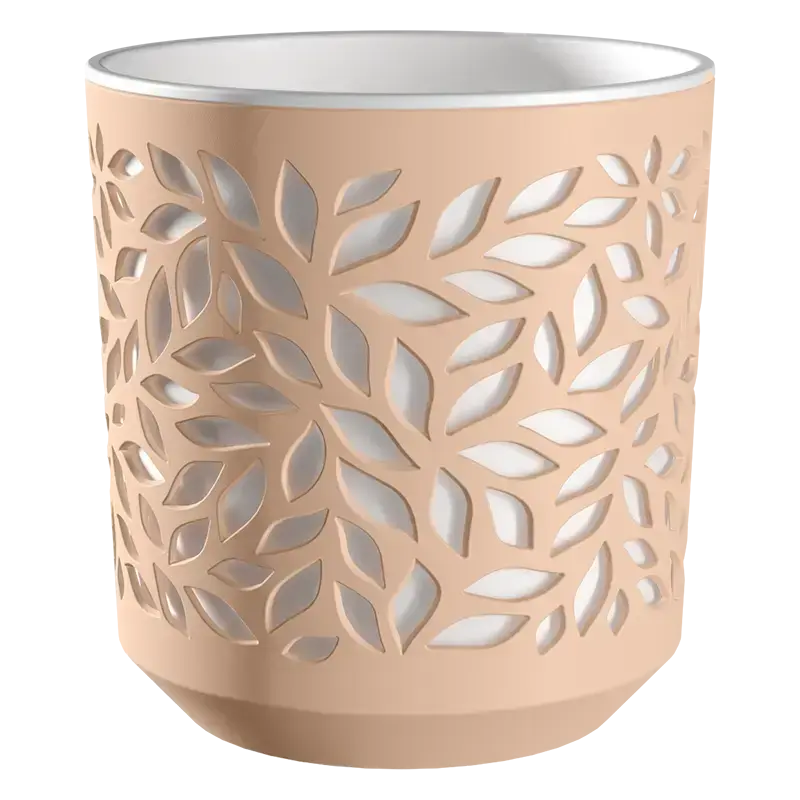 Кашпо имеет объем 2,5 литра и диаметр 16,2 см, что делает его идеальным для большинства домашних растений. Цветовая гамма пудрового и белого оттенков добавляет элегантности и стиля, а перфорированный дизайн в виде листьев создает эффект легкости и воздухопроницаемости. Выбирая кашпо «Leaves», вы получаете не только красивый, но и практичный элемент для вашего интерьера.