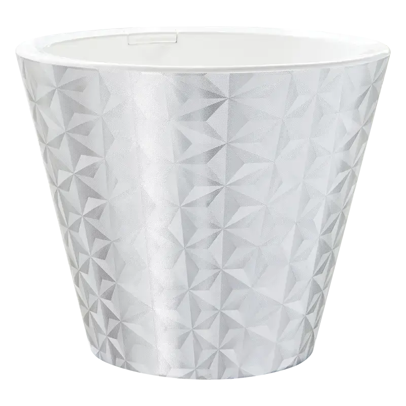 Белый матовый оттенок с перламутровым отливом гармонично сочетается с текстилем, деревом и металлом в интерьере. Геометрический узор создаёт игру света — кашпо выглядит объёмным при любом освещении.