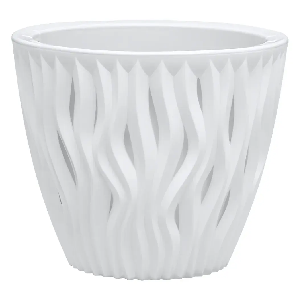 Кашпо выполнено из качественного пластика, что обеспечивает его долговечность и легкость. Белый цвет и рельефный дизайн делают его не только практичным, но и эстетически привлекательным. Размеры кашпо позволяют использовать его как в домашних условиях, так и в офисе, создавая уютную атмосферу.