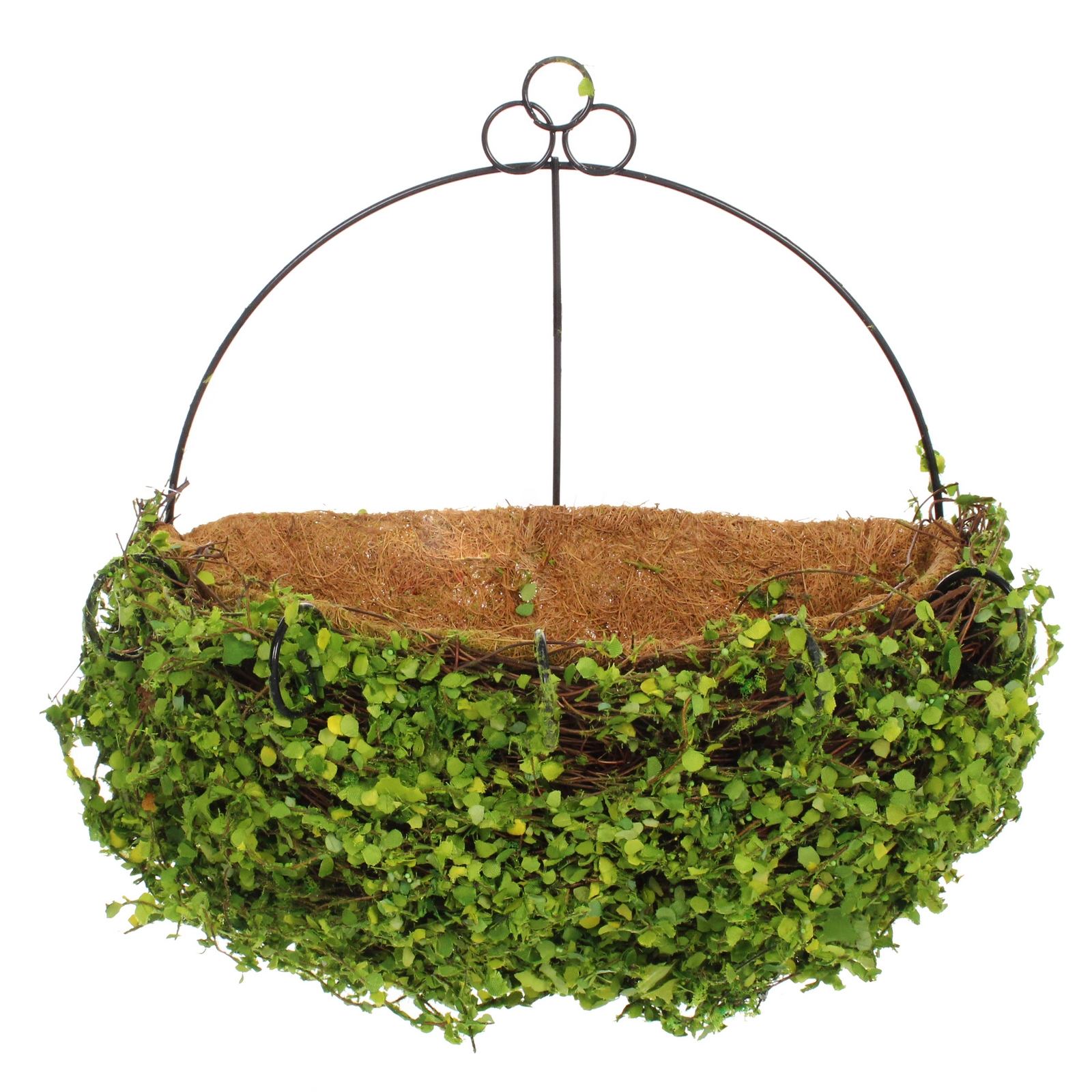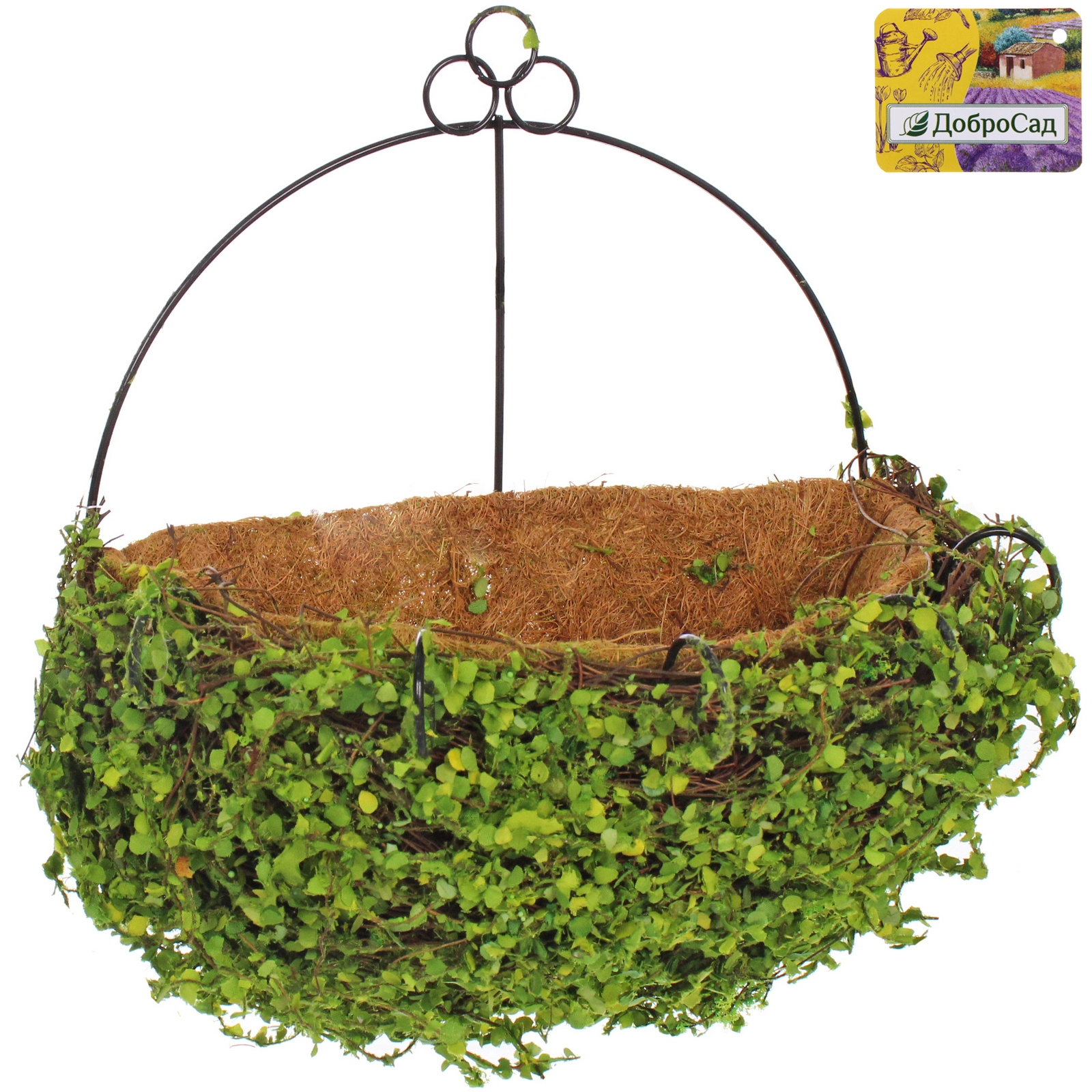 Прочный металлический каркас темного цвета гарантирует устойчивость конструкции и сохранение полусферической формы в течение многих сезонов. Внешний декор в виде густых зеленых листиков и веточек придает изделию завершенный и стильный вид, превращая обычный цветочный горшок в полноценный элемент ландшафтного декора. Кашпо устойчиво к внешним воздействиям, что позволяет использовать его как внутри помещений, так и на открытых террасах, верандах или в беседках.