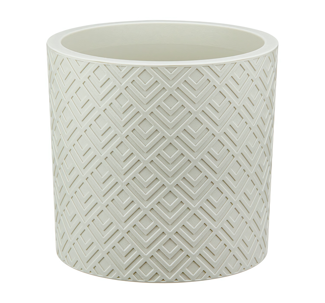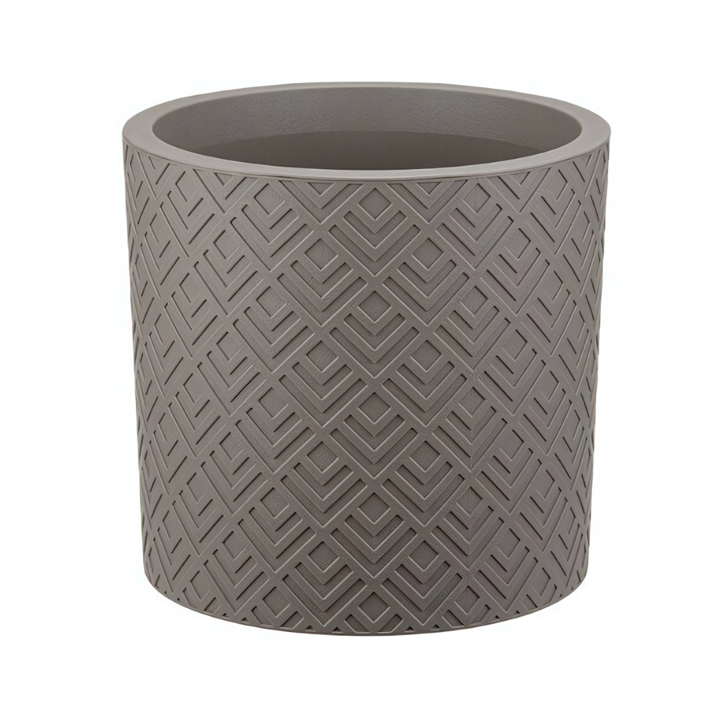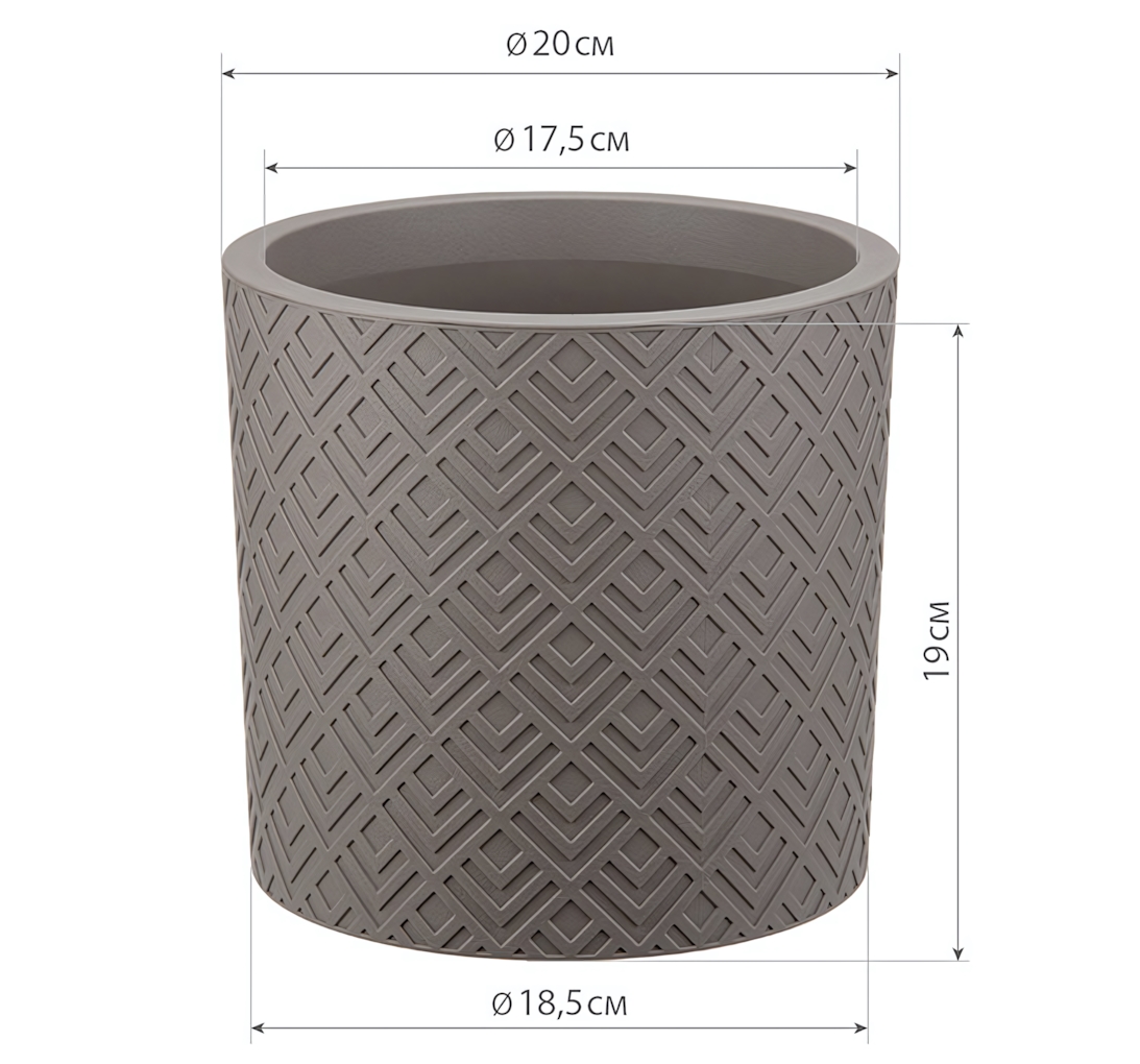Геометрический рельеф внешней поверхности не просто декоративен — он увеличивает жёсткость конструкции. Точные размеры (Ø20 см × 19 см) рассчитаны для большинства комнатных растений среднего размера.