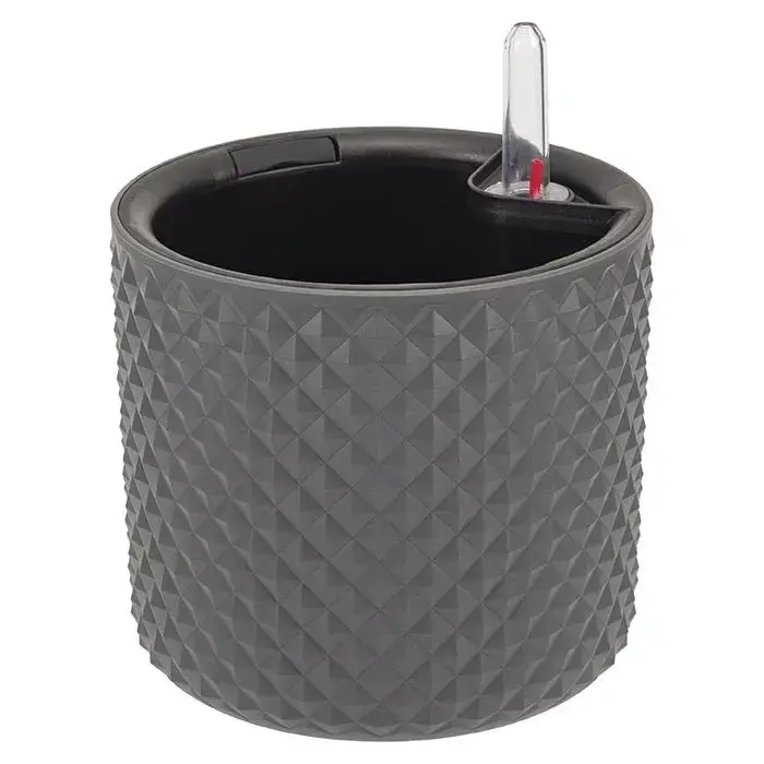Комплект из 12 кашпо с системой автополива обеспечивает идеальный уход за цветами без ежедневного контроля. Рельефный ромбовидный узор и графитовый оттенок создают стильный акцент в интерьере и саду.