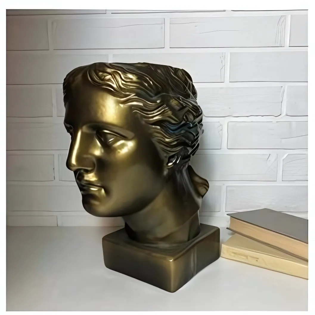 Это не просто горшок для цветов, а полноценное декоративное произведение, которое преобразит любую комнату. Гипсовая фигура в виде античной головы с детализированной проработкой волос станет стильным центром внимания на книжной полке, рабочем столе, каминной полке или в гостиной. Бронзовый оттенок с благородным металлическим отливом добавляет изделию солидности и винтажного шарма, гармонично сочетаясь с классическими, лофтовыми и современными интерьерами.
