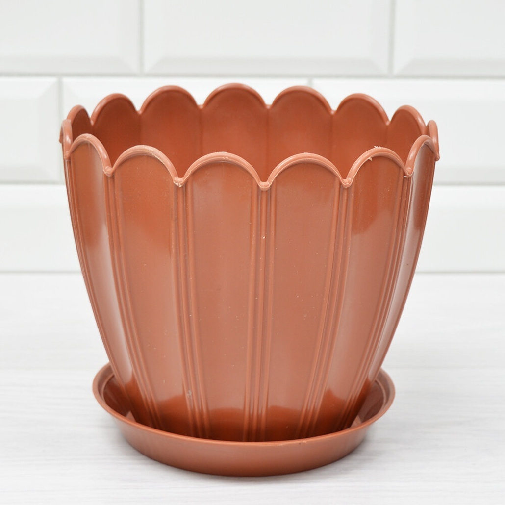 Пластиковое кашпо с поддоном сочетает функциональность и стиль — идеальное решение для любителей комнатных растений. Рифлёная текстура и волнообразный край создают эффект ручной работы, превращая обычный горшок в элемент интерьера.