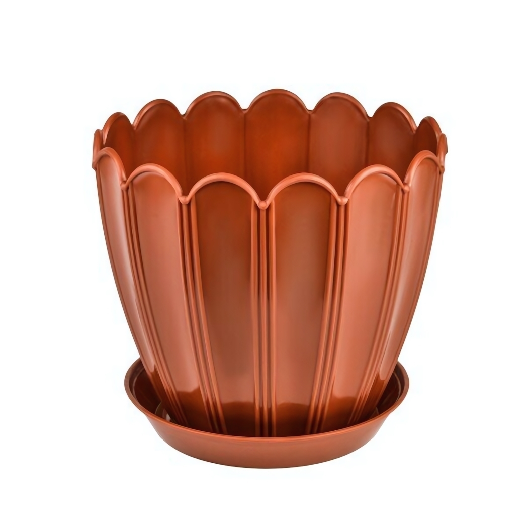 Это пластиковое кашпо с поддоном объемом 3,4л идеально подойдет для выращивания и ухода за комнатными и уличными цветами. Благодаря высокому корпусу с волнистым краем и вертикальными ребрами, оно сочетает эстетичный дизайн и практичность, позволяя обеспечить дренаж и защиту поверхности от воды. Конструкция легко моется и устойчива к воздействию влаги и температурных изменений, что позволяет использовать его как в помещении, так и на улице.