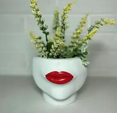 Это необычное декоративное кашпо мгновенно привлекает внимание благодаря оригинальной форме и контрастной цветовой гамме. Белая поверхность изделия в сочетании с ярко-красными губами создаёт выразительный и стильный акцент, который украсит любой интерьер. Если вы хотите добавить в пространство элемент с характером или ищете эффектный подарок — это кашпо станет удачным решением.