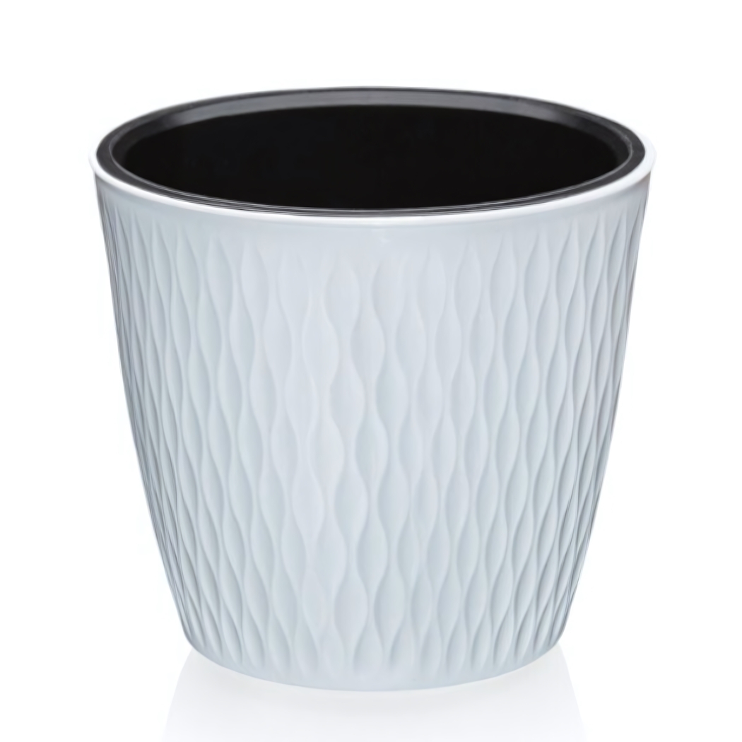 Кашпо выполнено из качественного пластика, что обеспечивает его долговечность и легкость. Белый цвет с рельефной текстурой в виде волнообразных линий придает ему стильный и современный вид. Внутренняя часть горшка черного цвета, что создает контраст и подчеркивает красоту ваших растений.