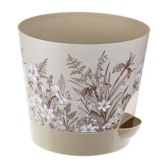 Глянцевая поверхность из морозостойкого пластика сохраняет презентабельный вид при длительном использовании на открытом воздухе. Декоративный рельеф с ботаническим принтом маскирует следы эксплуатации, сокращая частоту замены кашпо.