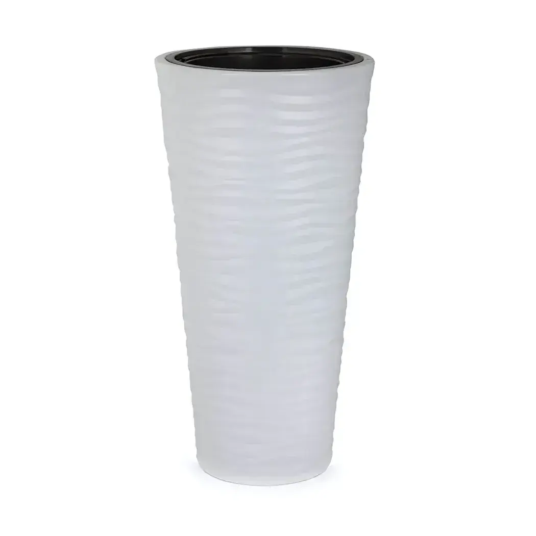 Цилиндрическая форма с сужением к основанию обеспечивает устойчивость даже при сильном ветре. Внутренняя чёрная вставка создаёт эффект грунта и маскирует дренажный слой. Подходит для фикусов, пальм, декоративных кустарников.