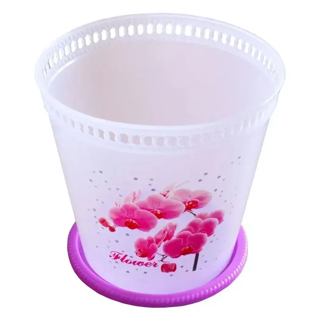 Кашпо для орхидей пластиковое 3л, прозрачное с рисунком цветов, перфорация, пурпурное основание