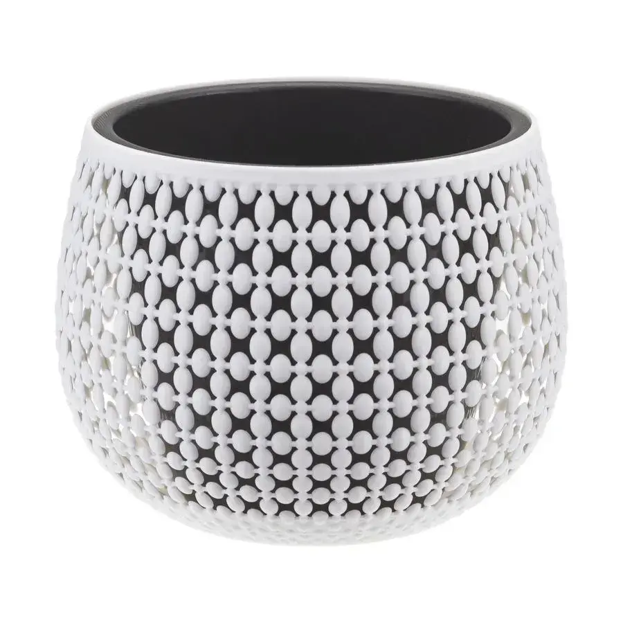 Каждое кашпо имеет диаметр 17,5 см и объем 1,5 литра — оптимальный размер для большинства комнатных растений. Внутренняя черная вставка создает контраст с белым внешним корпусом, подчеркивая красоту зелени. Легкий вес (менее 200 г на изделие) позволяет свободно перемещать растения.