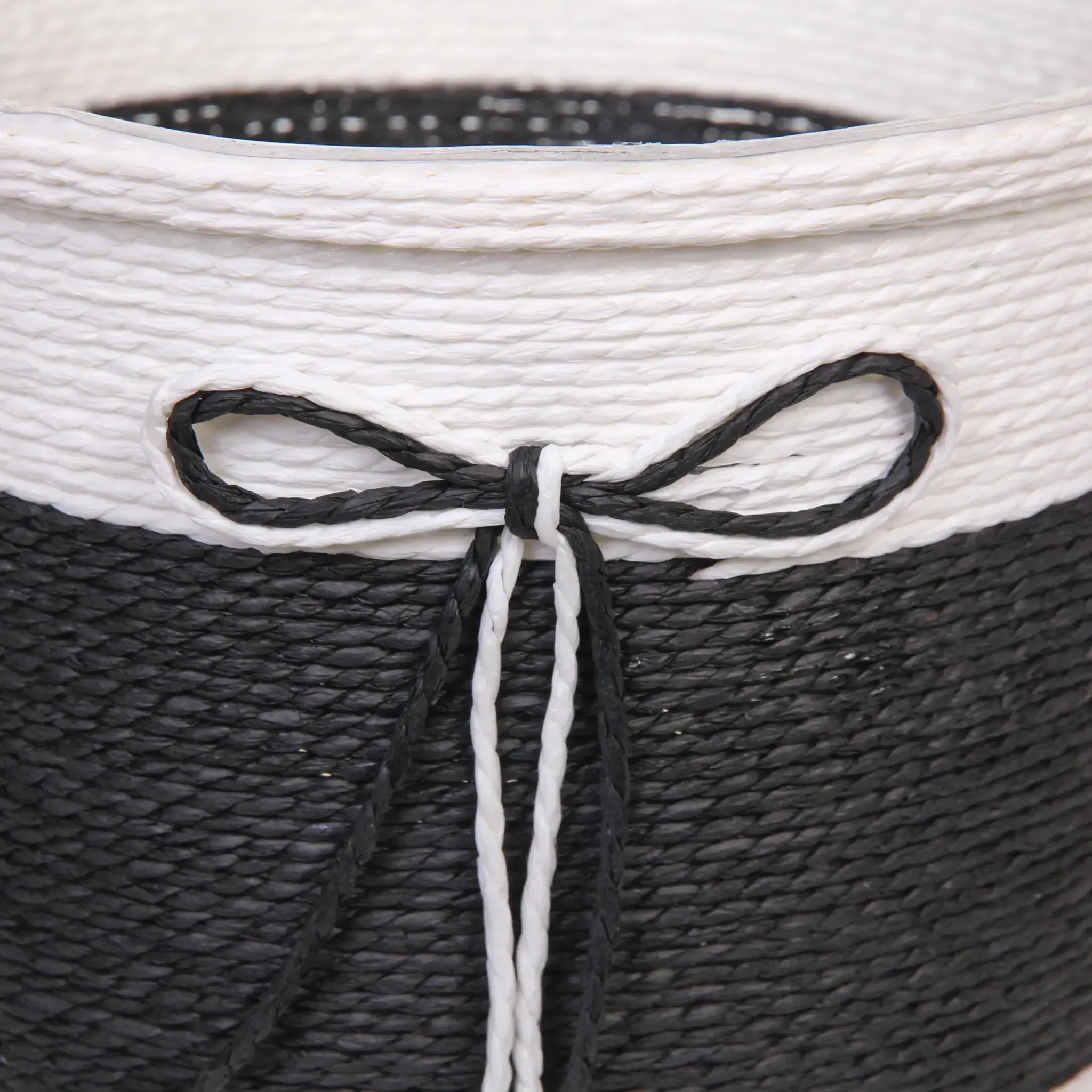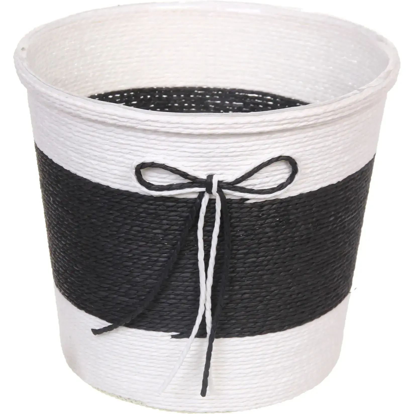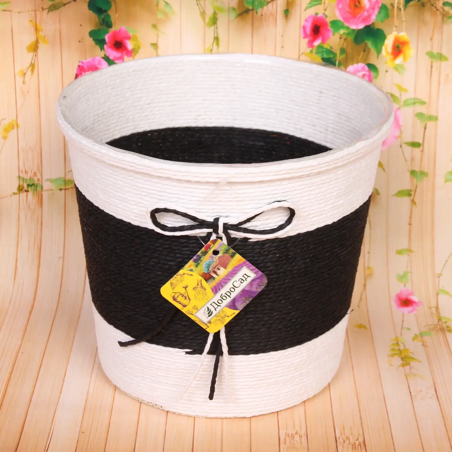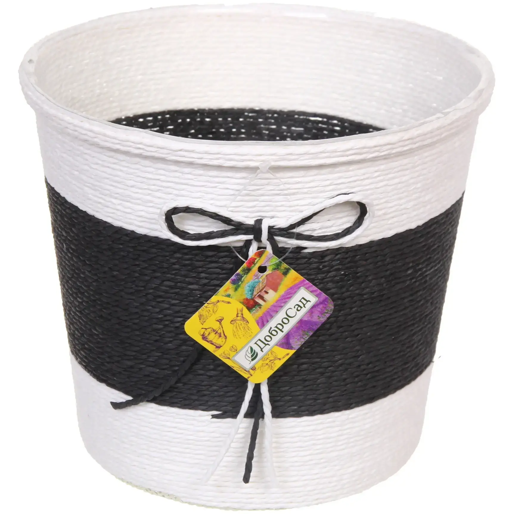 Размеры кашпо составляют 20,5 см в высоту и 17 см в диаметре. Цветовая гамма — черный и молочный, что позволяет легко сочетать его с другими элементами декора. Кашпо выполнено из прочного пластика и полиэстера, что обеспечивает долговечность и надежность в использовании.