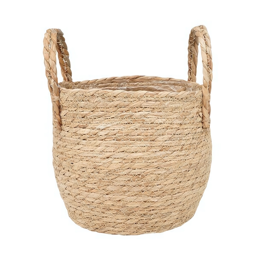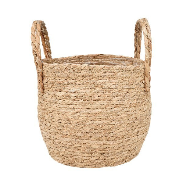 Размеры внешние: диаметр 28,5 см, высота 21,5 см. Цвет — светло-бежевый, оттенок натурального растительного волокна. Материал: рогоз (наружная часть), полипропиленовая пленка (внутри для защиты от влаги). Кашпо поставляется в единственном экземпляре.
