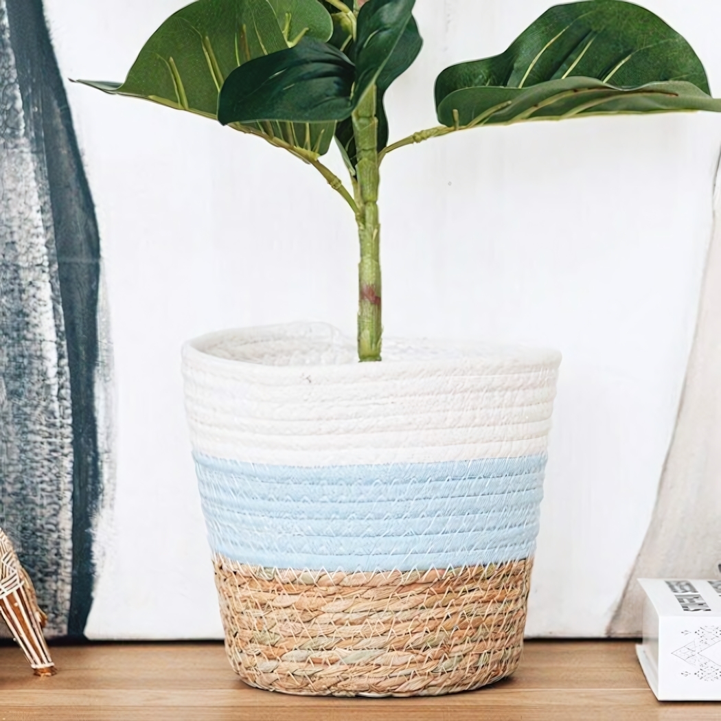Преимущества: изготовлено из рогоз и хлопкового шнура, что обеспечивает экологичность и прочность. Объем 4,5 литра позволяет расположить крупные культуры. Яркий дизайн с голубым и белым цветами добавит свежести и элегантности интерьеру.