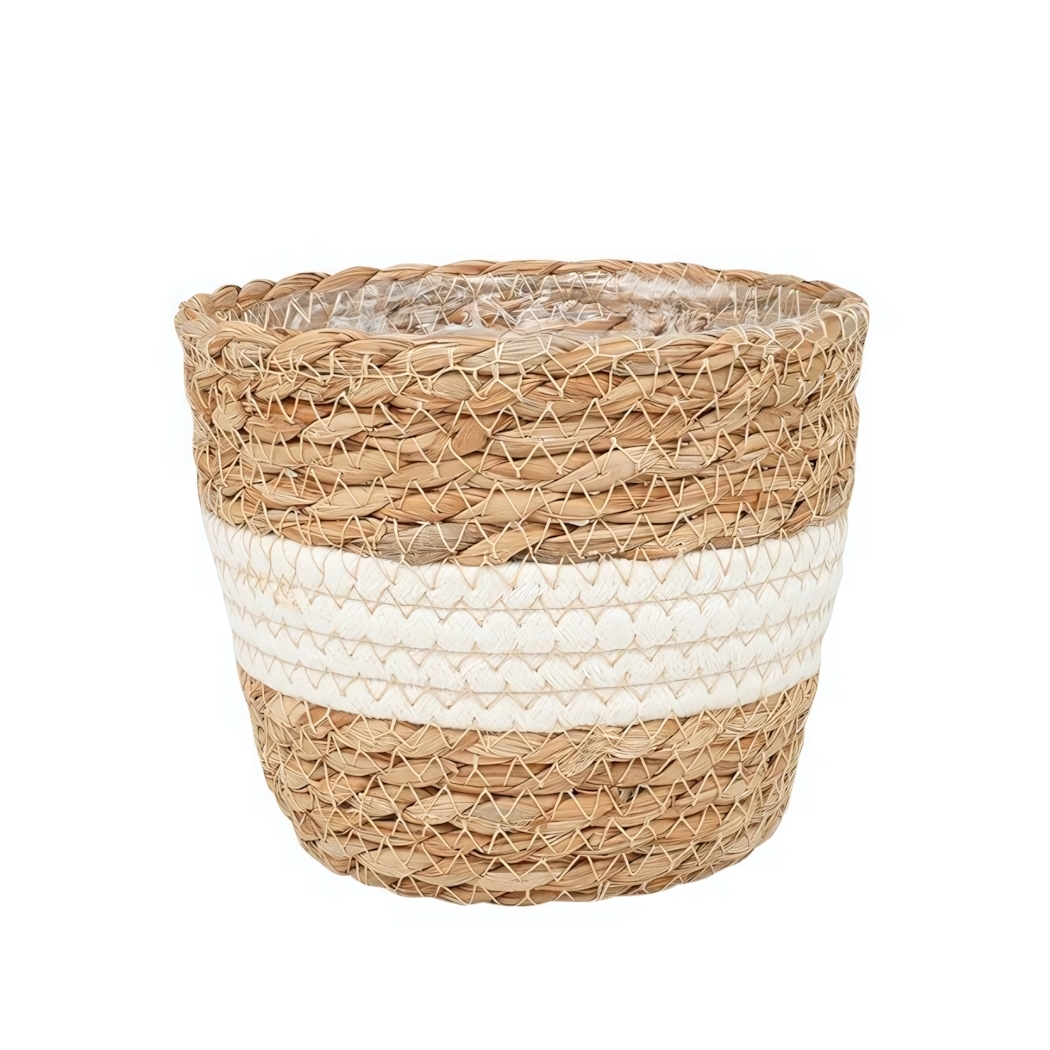 Кашпо плетеное «Африка» 1,5 л, 165 × 165 × 135 мм, рогоз, хлопковый шнур, белая полоска, полипропиленовый вкладыш