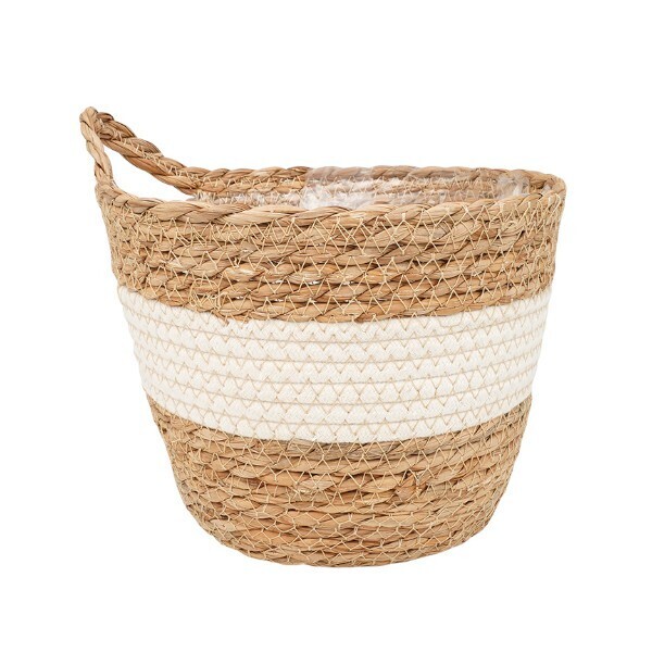 Внешний размер: диаметр 190 мм, высота 160 мм, ширина 190 мм. Цвет: натуральный с белой горизонтальной полосой. Внутри — прозрачная вкладка из полипропилена. Удобная ручка для переноски позволяет легко менять расположение даже с растением внутри.