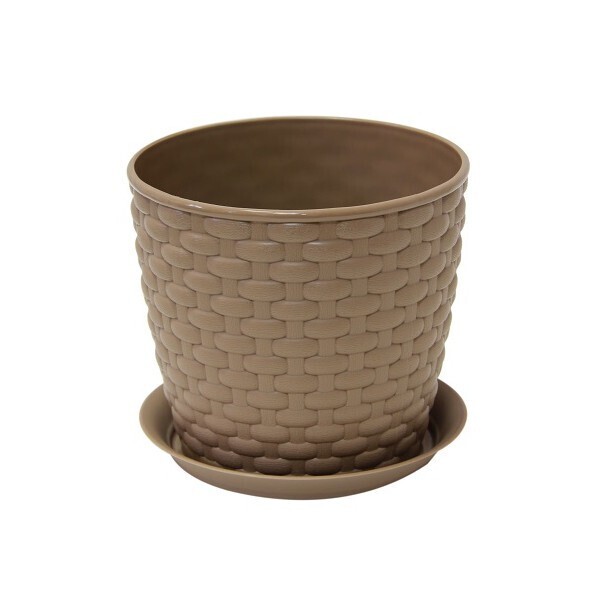 Кашпо выполнено из российского пластика, цвет — бежевый ротанг. Размеры: диаметр 135 мм, высота примерно 135 мм, объем внутри — 1 литр. Благодаря современному дизайну и надежным материалам, оно станет отличным дополнением интерьера или сада, сочетая эстетику и функциональность.