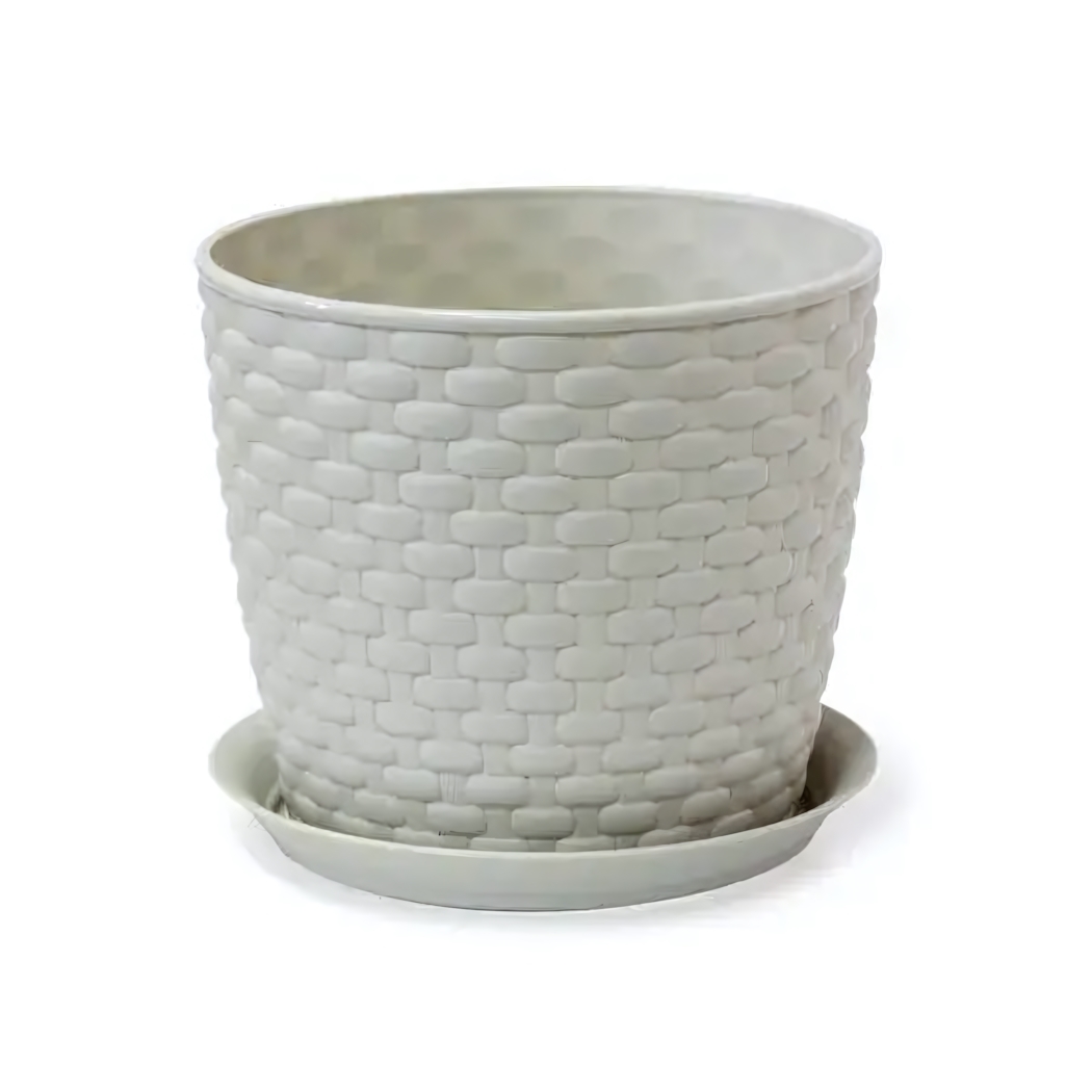 Кашпо пластиковое под ротанг D155мм 2л с поддоном, цвет светло-серый, 15.5х15.5см