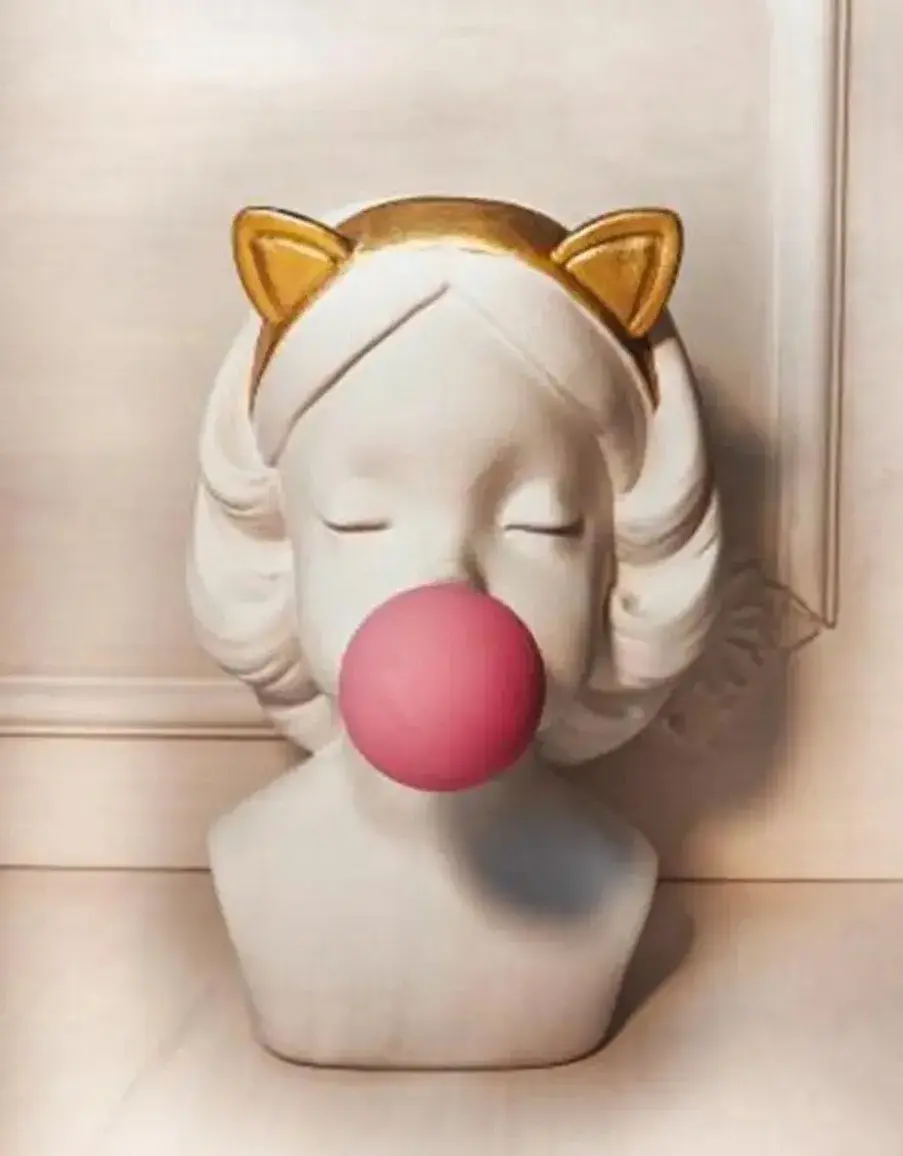 Добавьте в свой дом или офис яркую деталь, способную привлечь внимание и подчеркнуть индивидуальность пространства. Кашпо-статуэтка «Мия» выполнена из высококачественного гипса, имеет мягкий светлый оттенок и нестандартный дизайн в виде женской головы с нежным выражением лица, закрытыми глазами и золотистыми кошачьими ушками. Розовый элемент в области рта имитирует надув пузыря из жевательной резинки, что придаёт изделию игривость и современный характер.