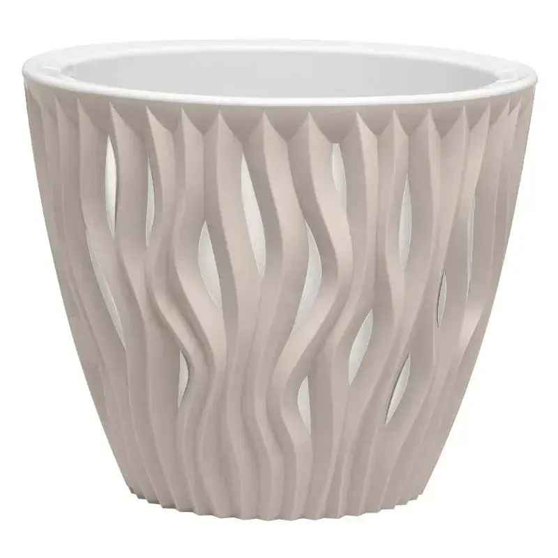 Кашпо 'Вдохновение' объёмом 3 литра в нежном пудровом оттенке сочетает стиль и функциональность. Рельефные волнообразные линии создают изысканную игру света и тени, превращая обычный горшок в элемент декора.