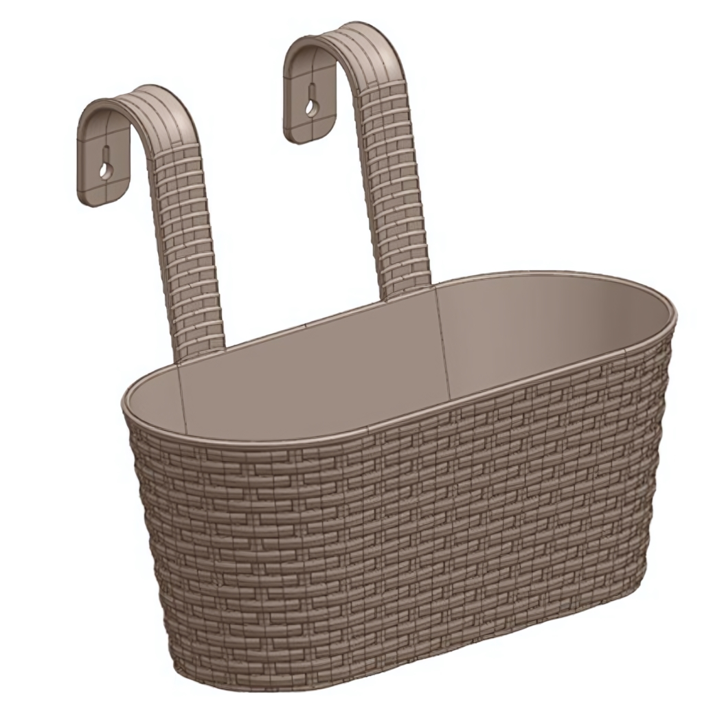 Кашпо оснащено двумя надежными крючками для подвеса, что обеспечивает устойчивое и безопасное крепление на стене, заборе, решетке или любой другой вертикальной поверхности. Конструкция крючков с продолговатыми отверстиями позволяет использовать различные виды крепежа: шурупы, гвозди, специальные крюки.