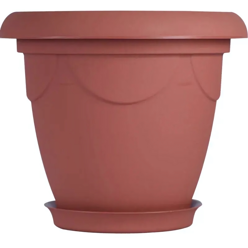 Материал — качественный пластик, форма — круглая с закруглённым поддоном. Терракотовый оттенок делает кашпо подходящим для разных типов помещений и садовых зон.