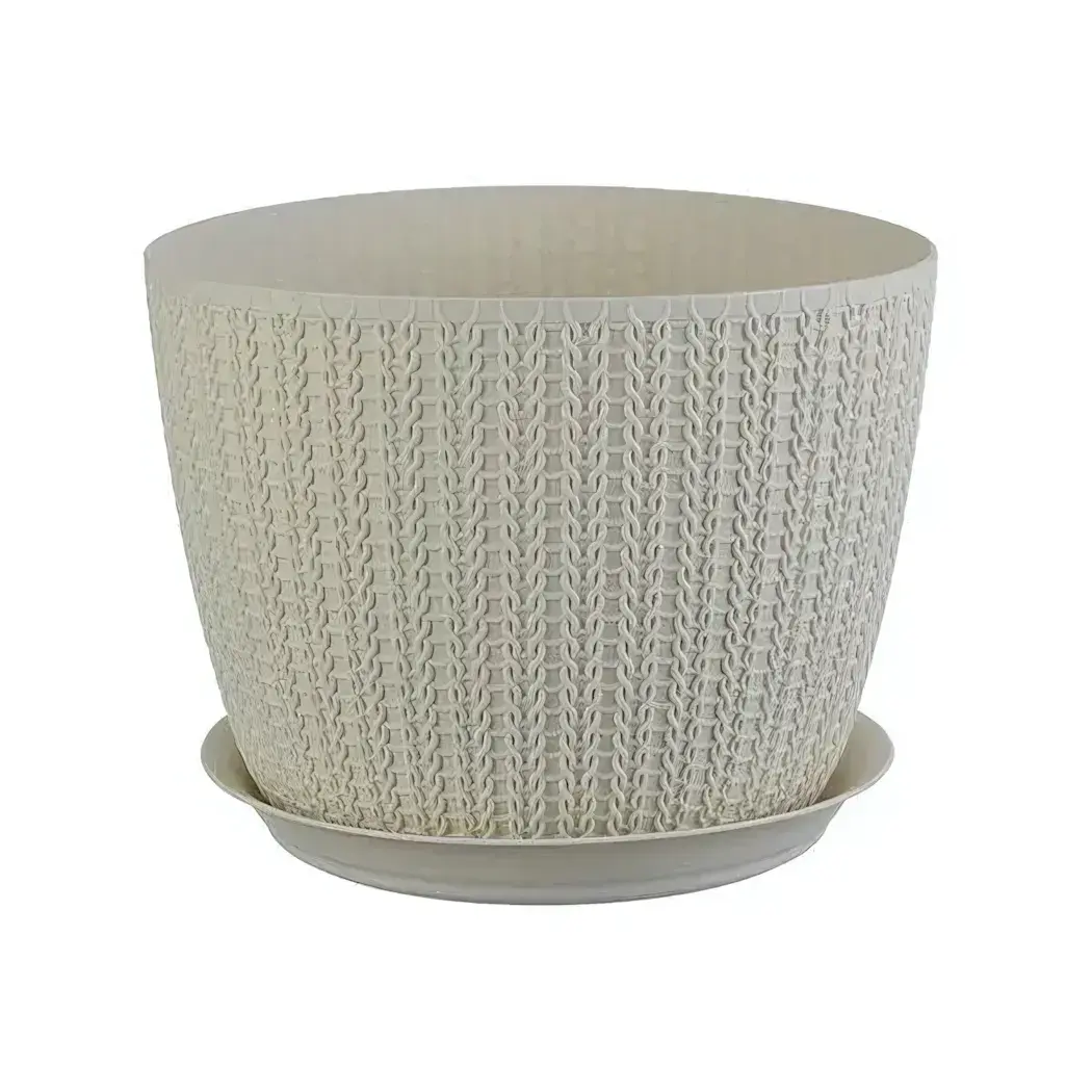 Кашпо пластиковое с поддоном D18см, 2.8л, дизайн 'Вязание', белый ротанг, 14х18см