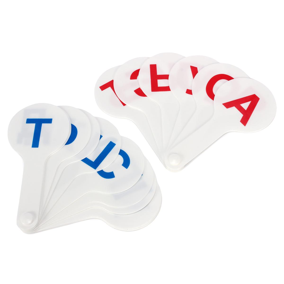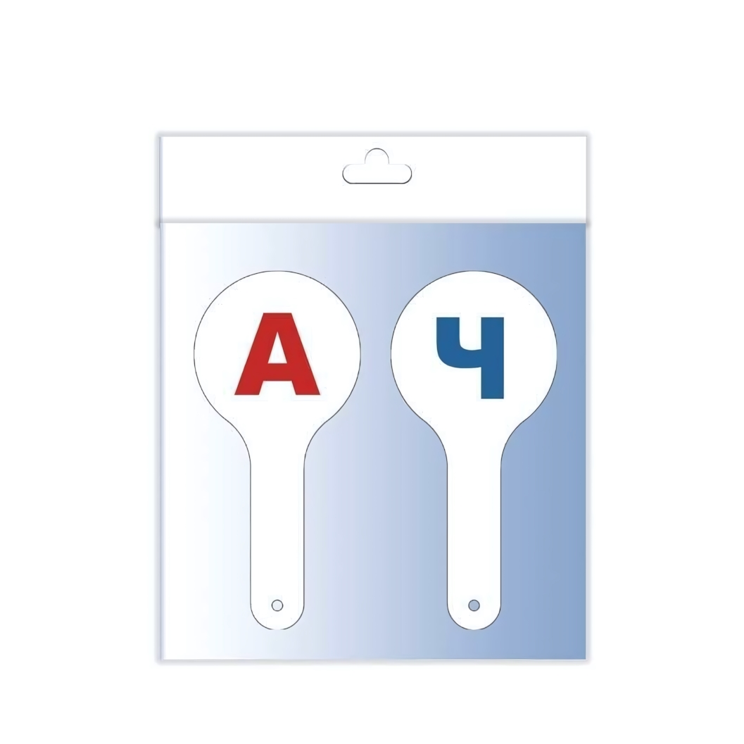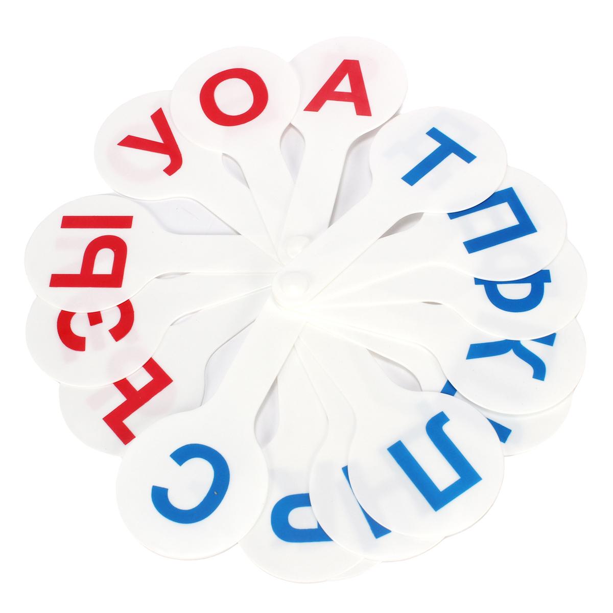 В наборе представлены карточки с гласными и согласными буквами русского алфавита. Каждая карточка имеет удобную ручку для комфортного использования. Цвета букв – красный и синий, что помогает различать гласные и согласные.