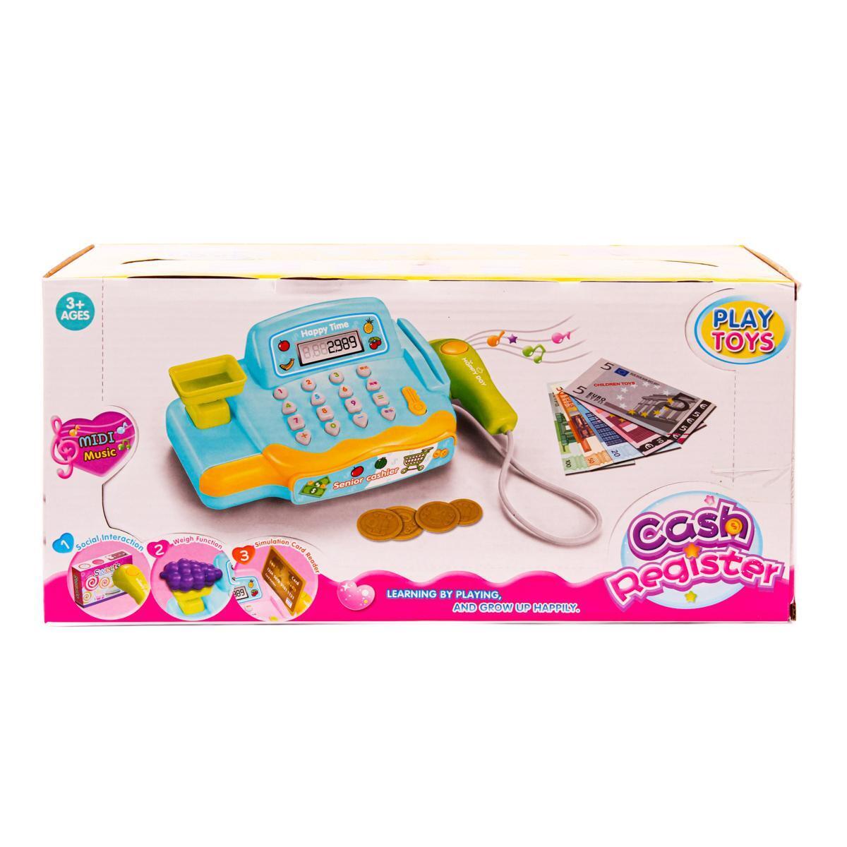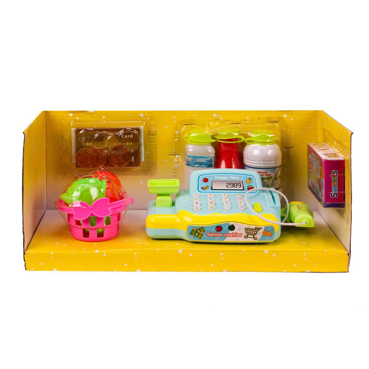 Игровой набор кассовый аппарат с аксессуарами для ролевых игр, монеты, купюры, продукты, светло-голубой, желтый, зеленый