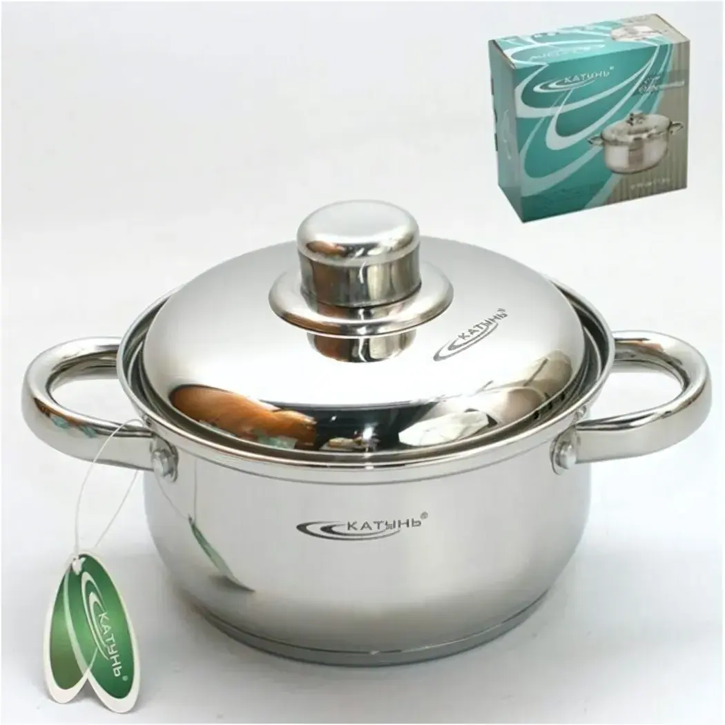 Кастрюля имеет округлую форму и высокие стенки, что позволяет готовить большие порции. Серебристый цвет с блестящей отделкой придает ей элегантный вид, а логотип производителя «КАТЫНЬ» подчеркивает качество и надежность. Размер кастрюли идеально подходит для повседневного использования, а ее стильный дизайн украсит любую кухню.