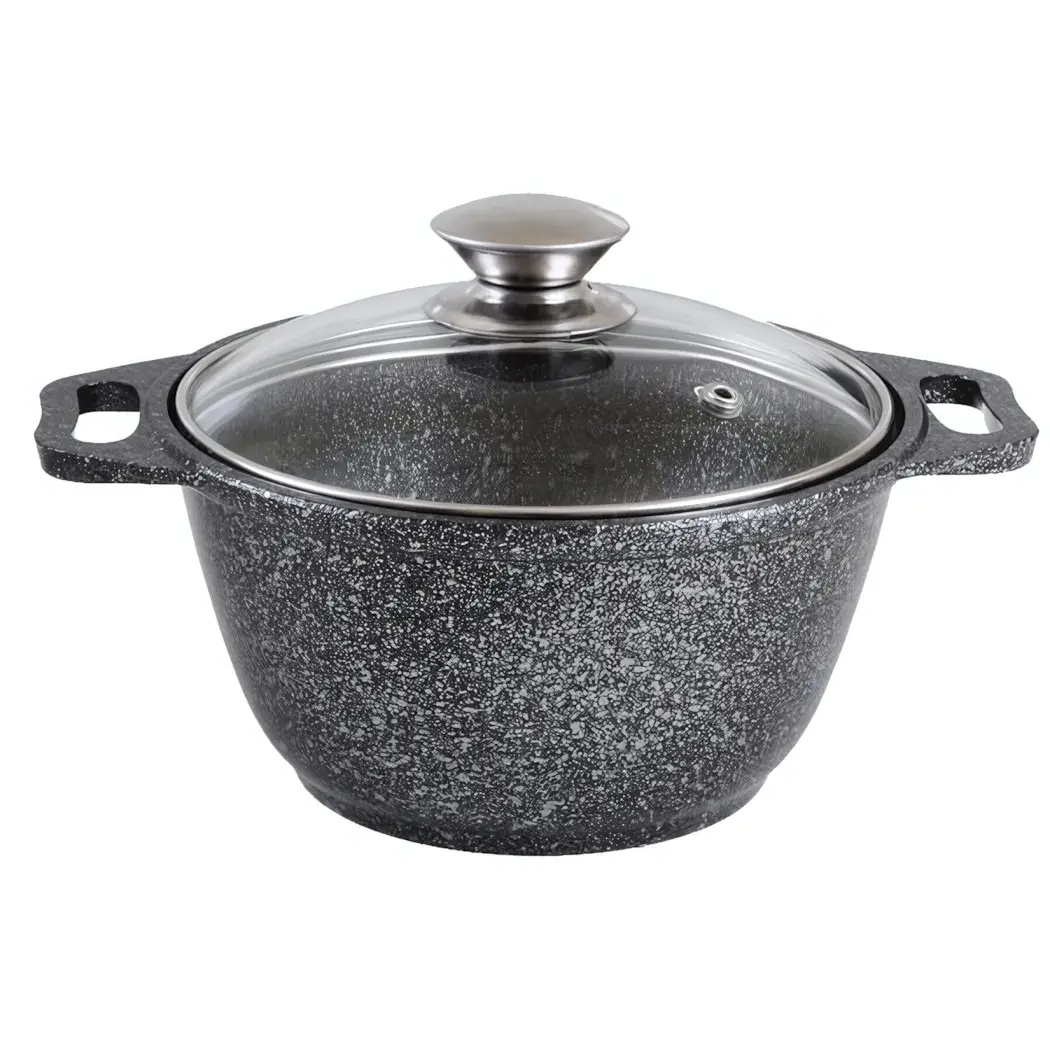Кастрюля имеет объем 1 литр и выполнена из литого алюминия, что обеспечивает равномерное распределение тепла. Черный цвет с белыми вкраплениями придает ей стильный вид, а две удобные ручки по бокам делают ее переноску легкой и безопасной. Размер кастрюли идеально подходит для приготовления небольших порций, что делает ее универсальным инструментом на вашей кухне.