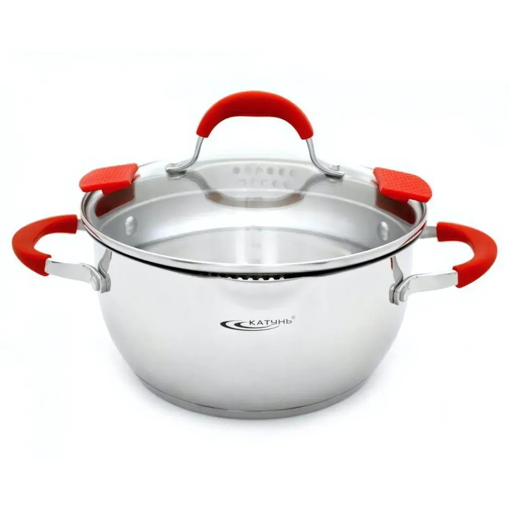 Кастрюля имеет округлую форму и гладкую блестящую поверхность, что делает ее легкой в уходе. Размеры кастрюли не указаны, но ее объем в 2,2 литра позволяет готовить достаточно пищи для семьи. Логотип бренда «КАТУНЬ» на корпусе подчеркивает высокое качество и надежность данного изделия.
