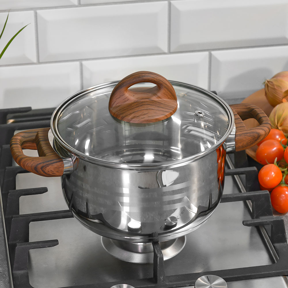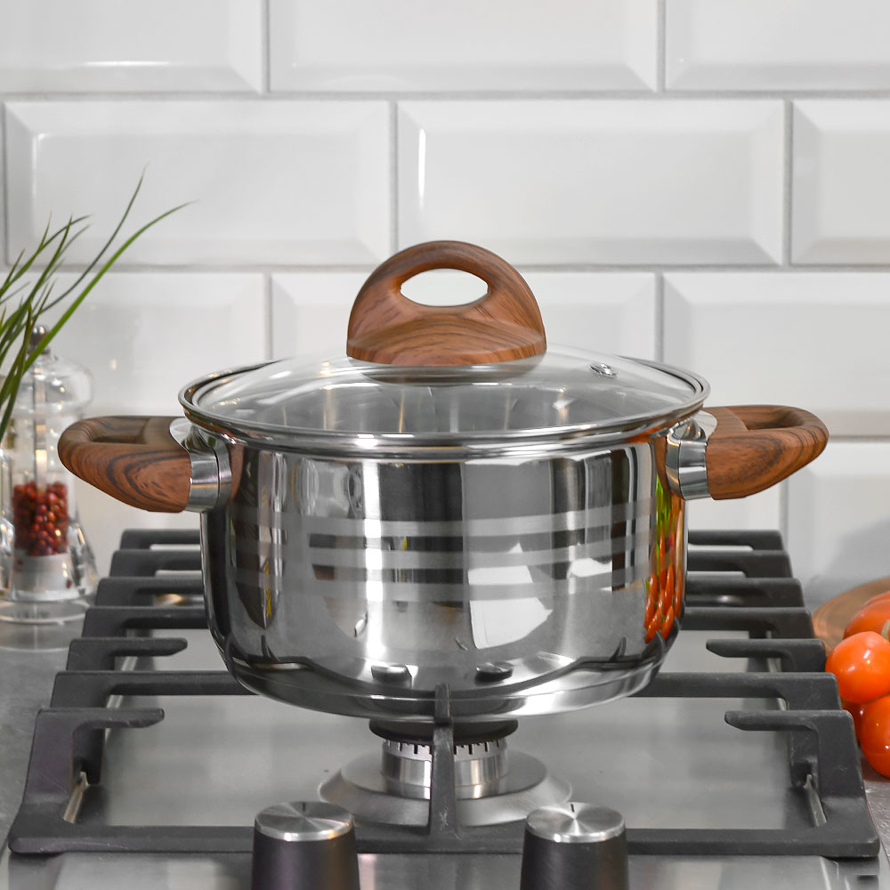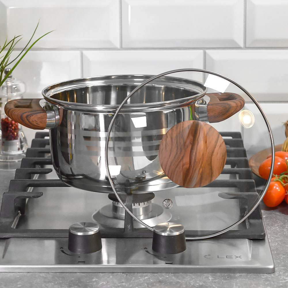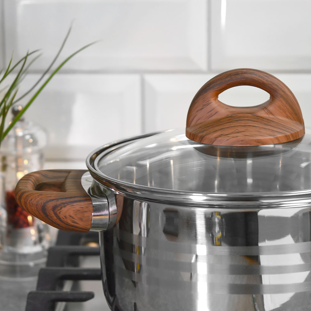 Боковые ручки и ручка крышки имеют декоративное покрытие с текстурой под дерево, что придает посуде уютный внешний вид и делает ее гармоничным элементом кухонного интерьера.