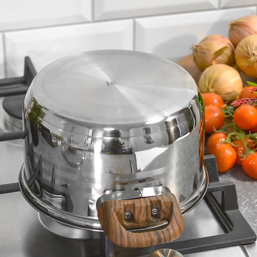 Корпус выполнен из нержавеющей стали с глянцевой поверхностью и декоративными матовыми полосами. Материал устойчив к коррозии, не впитывает запахи и легко очищается. Прочное индукционное дно обеспечивает равномерный нагрев и стабильность на плите.