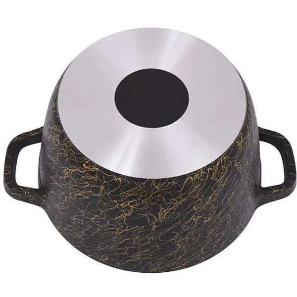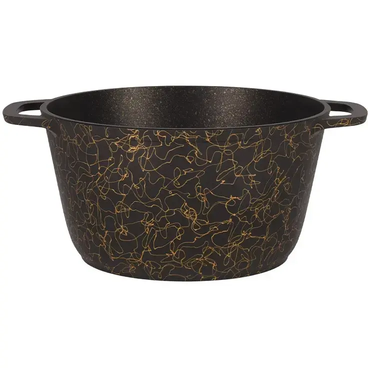 Объем 2.5 литра оптимален для семьи из 3-4 человек. Толстые стенки из литого алюминия обеспечивают быстрое распределение тепла, а усиленное дно предотвращает деформацию. Золотистый декор нанесен методом термопечати для долговечности рисунка.