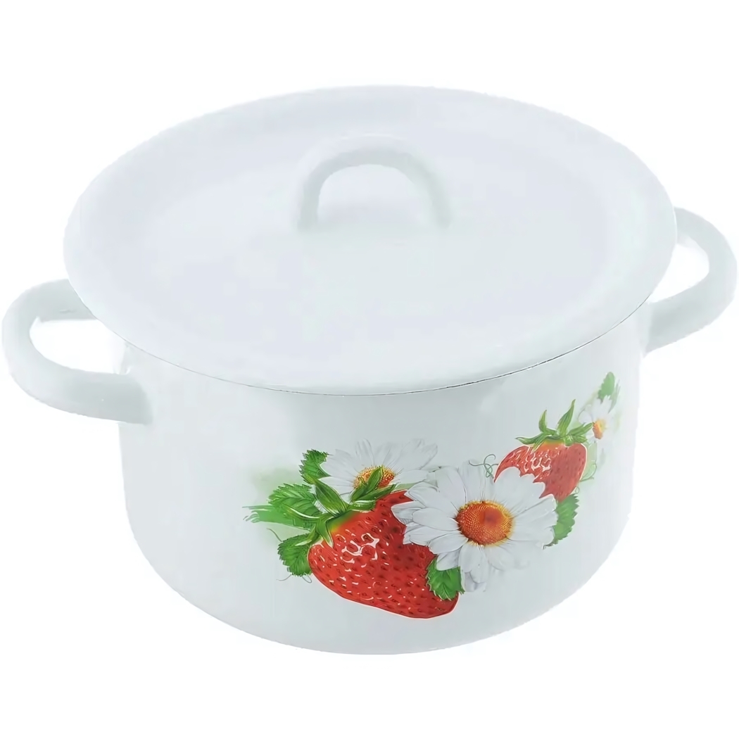 Кастрюля эмалированная 2л с крышкой, декор клубника/цветы, Магнитогорская эмаль