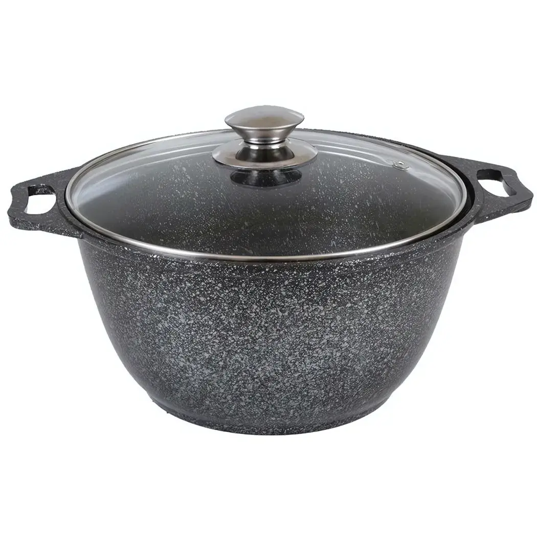 Объем кастрюли составляет 2 литра, что идеально подходит для приготовления порций на 2-3 человека. Черный цвет с серым текстурированным узором придаст вашей кухне стильный вид. Кастрюля имеет округлую форму и массивные ручки, что обеспечивает удобный захват и переноску.