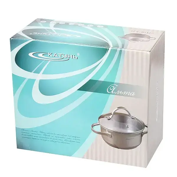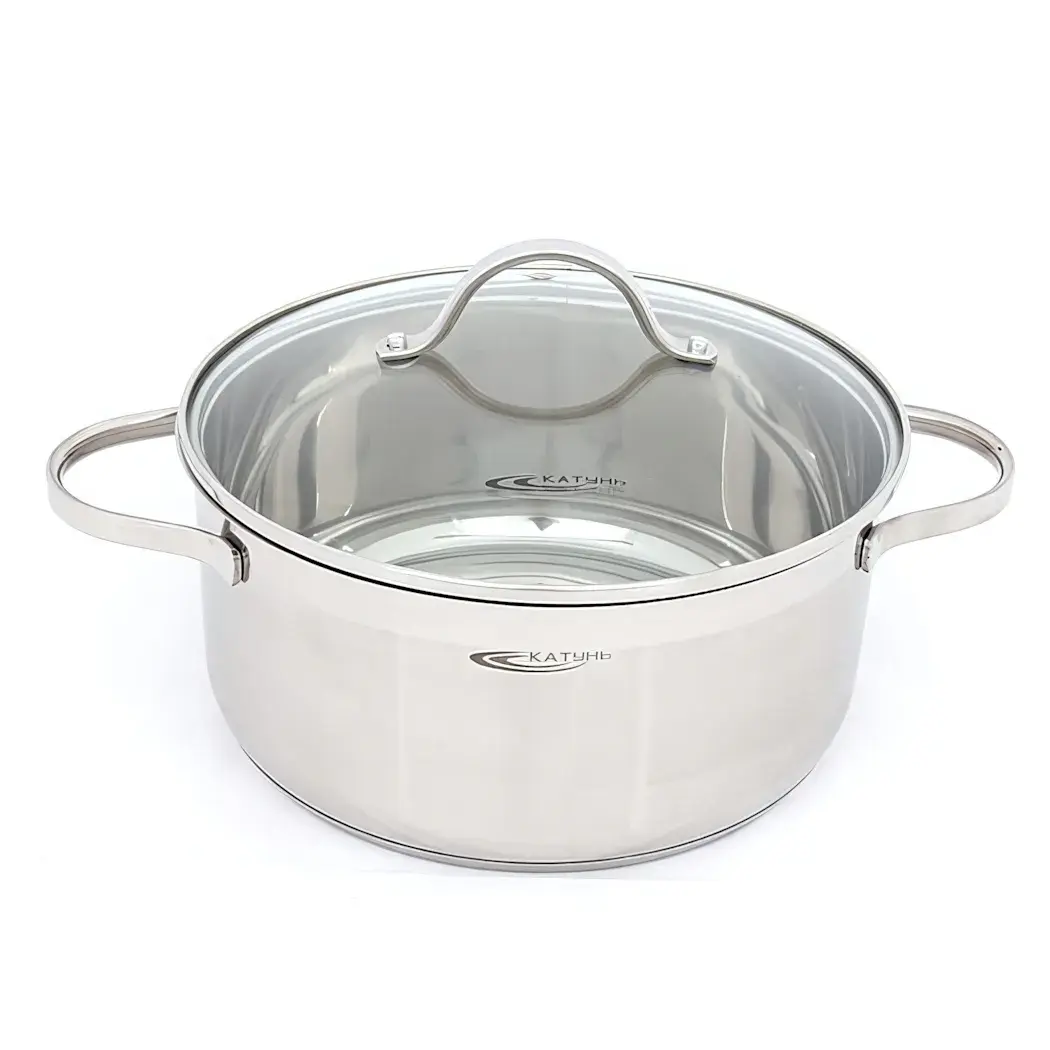 Объем кастрюли составляет 4,2 литра, что позволяет готовить большие порции. Диаметр кастрюли примерно 24-26 см, что делает её достаточно вместительной для различных блюд. Крышка выполнена из стекла с металлической ручкой, что добавляет удобства в использовании. Кастрюля имеет логотип «КАТУНЬ», что подтверждает её высокое качество.