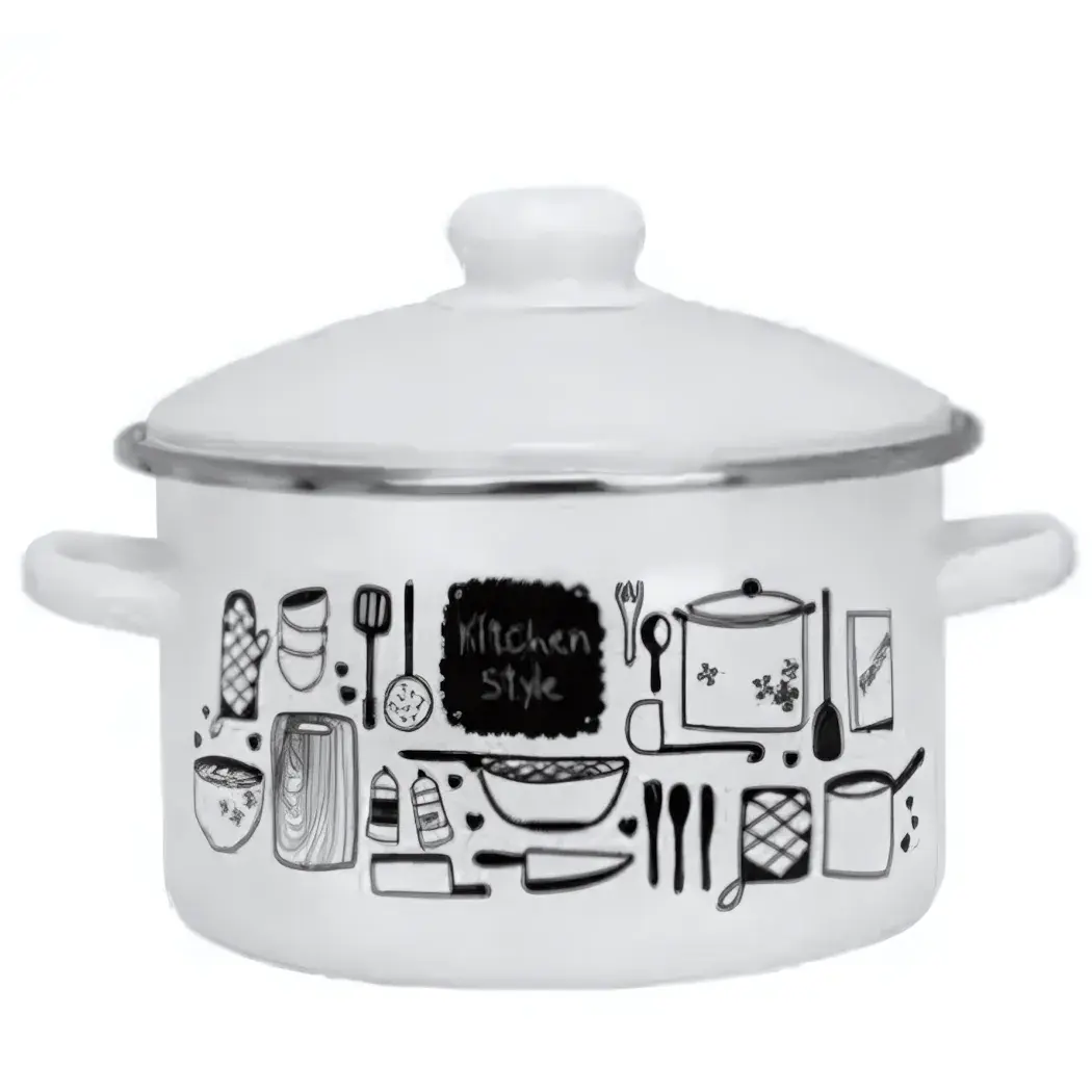 Кастрюля выполнена из высококачественной эмалированной стали, что обеспечивает длительный срок службы и простоту ухода. Её дизайн с изображением кухонных принадлежностей органично впишется в интерьер любой кухни.