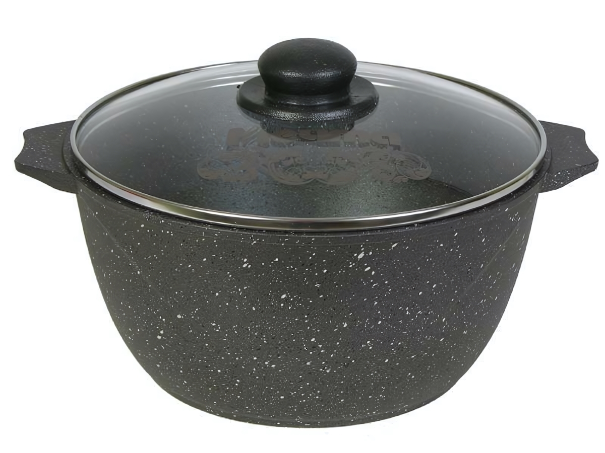 Кастрюля выполнена из качественного литого алюминия, что гарантирует ее прочность и долговечность. Стеклянная крышка с черной ручкой добавляет удобства в использовании. Размер кастрюли позволяет готовить большие порции, что идеально подходит для семейных обедов и ужинов.