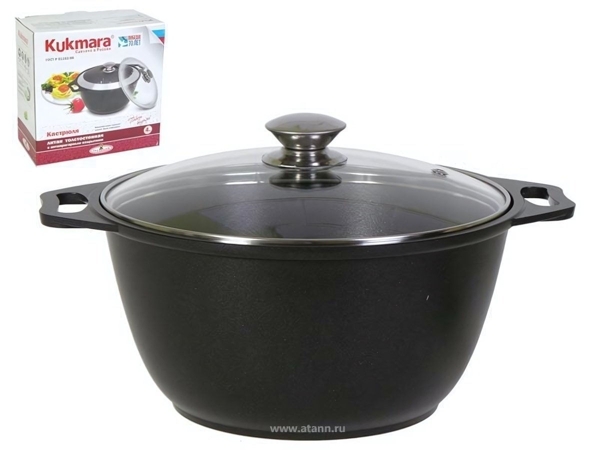 Кастрюля Kukmara 4л с антипригарным покрытием и стеклянной крышкой, литой алюминий