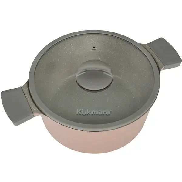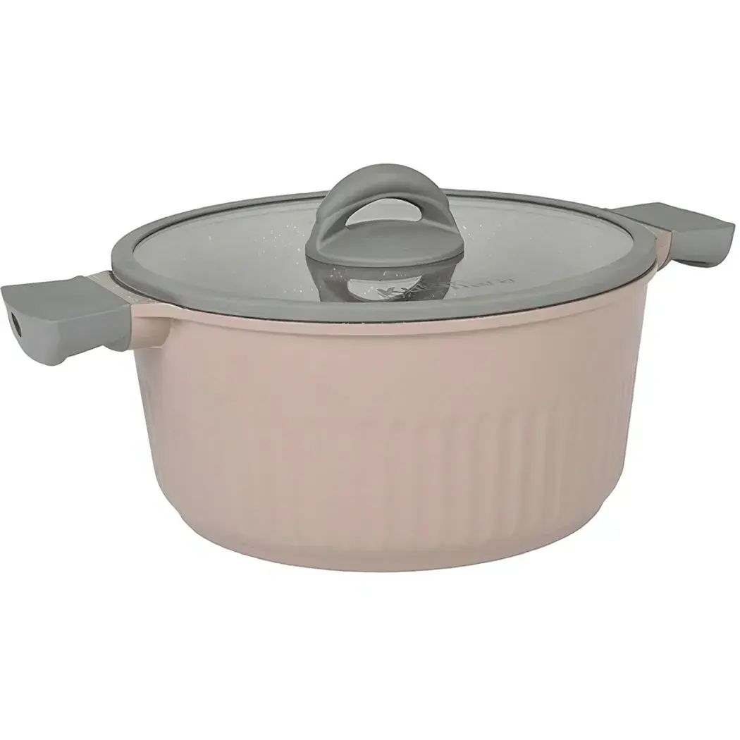 Кастрюля изготовлена из литого алюминия, что обеспечивает равномерное распределение тепла. Цвет капучино и рифленая поверхность придают ей уникальный вид. Размер кастрюли составляет 5,2 литра, что позволяет готовить большие порции. Стеклянная крышка с металлическим ободком и ручкой серого цвета завершает образ этой стильной кастрюли.