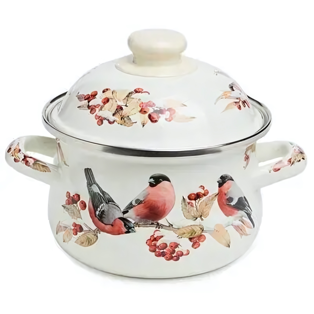 Кастрюля эмалированная 1.5 л с крышкой, серия "Снегири"