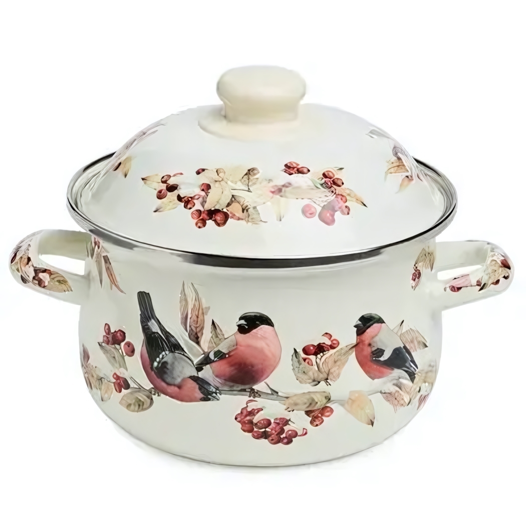 Кастрюля эмалированная 2.0л с крышкой, серия "Снегири"