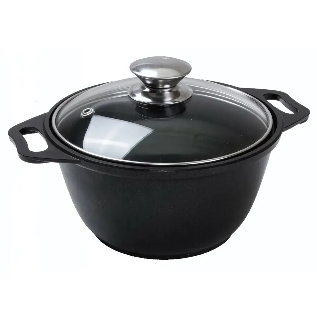 Кастрюля имеет средний размер, что делает ее универсальной для различных блюд. Черный цвет и гладкая поверхность придают ей стильный вид, а стеклянная крышка с металлическим ободком добавляет элегантности. Эта кастрюля станет не только функциональным, но и эстетичным элементом вашей кухни.
