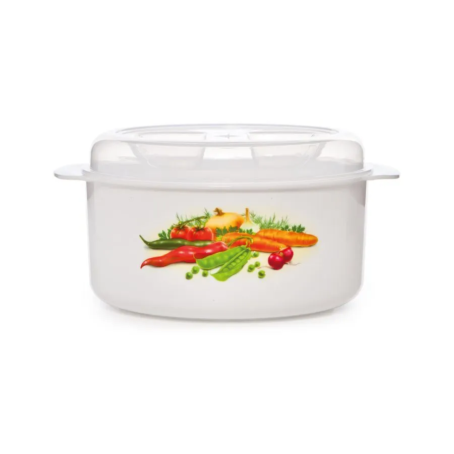 Эта кастрюля специально разработана для использования в микроволновых печах. Благодаря удобным боковым ручкам на корпусе и выступам на крышке, ёмкость легко и безопасно доставать из печи даже в горячем состоянии. Прозрачная крышка позволяет контролировать процесс приготовления, не открывая её, что сохраняет температуру и предотвращает разбрызгивание.