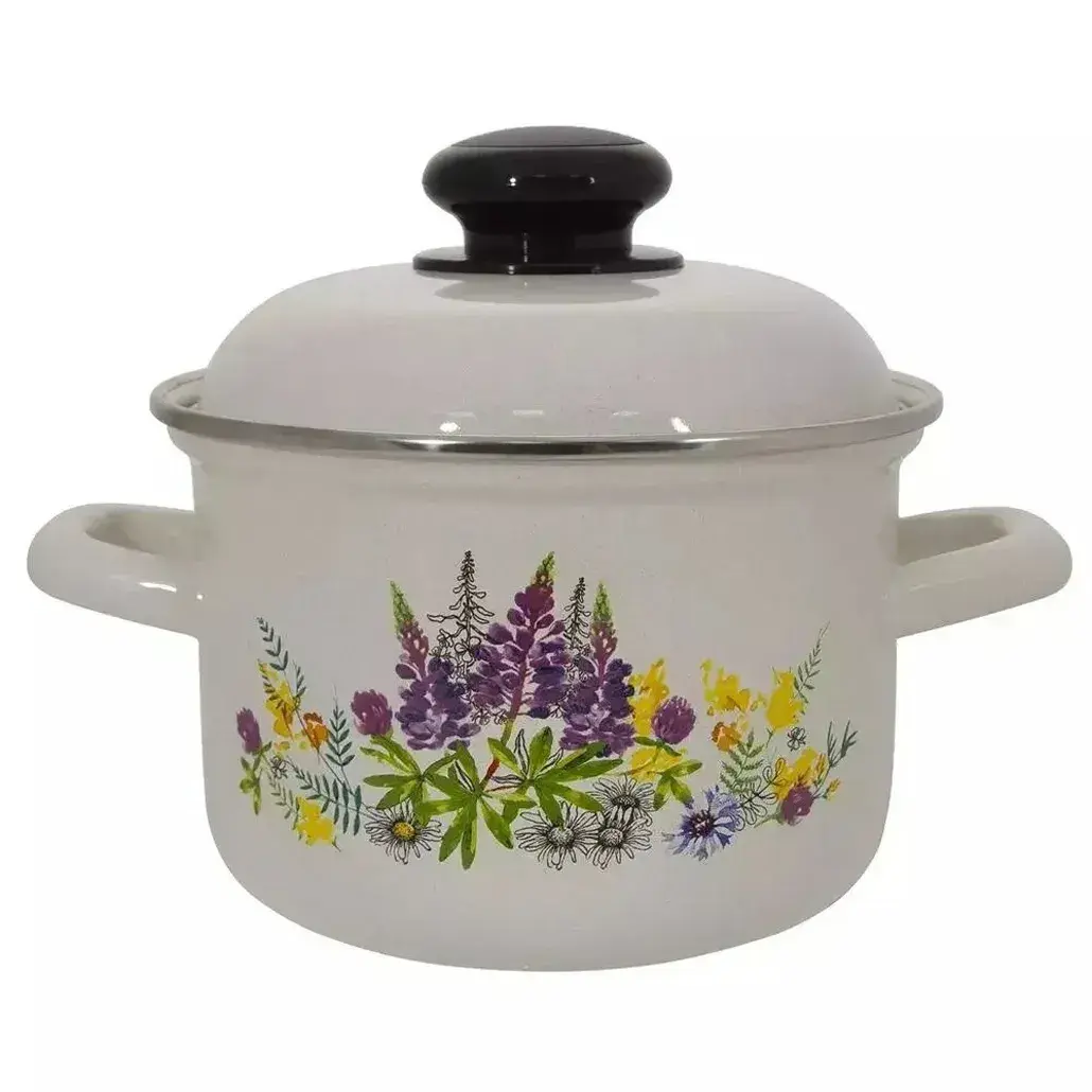 Кастрюля эмалированная "Люпины" 1,5л с цветочным рисунком, металл, белая с крышкой